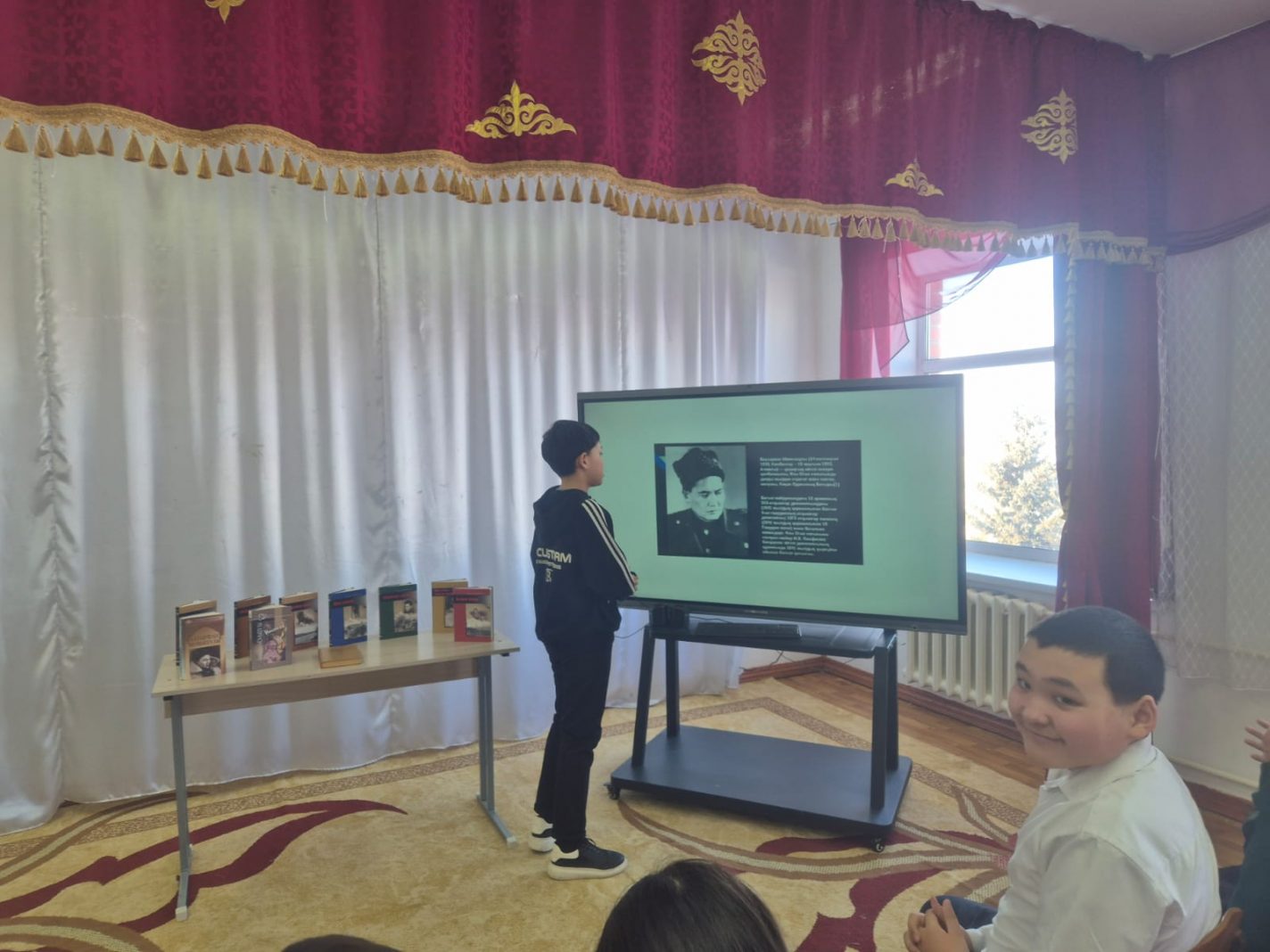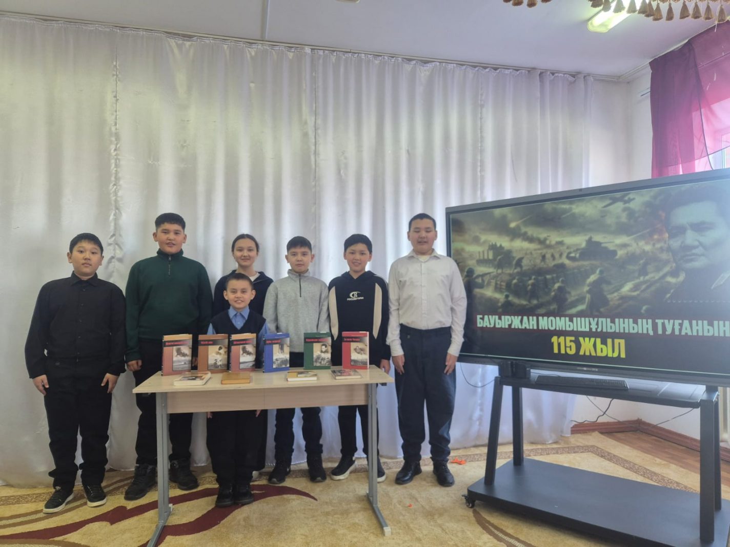 Бауыржан Момышұлының туғанына 115 жылдығына  орай кітапханашы  5 - 6 сынып оқушыларымен іс-шара өткізді. Оқушылар  қазақ халқының даңқты ұлы, батыр жазушы Бауыржан Момышұлының өмір жолымен, ерлікке толы тақдырымен танысып, шығармашылығына көңіл бөлді.