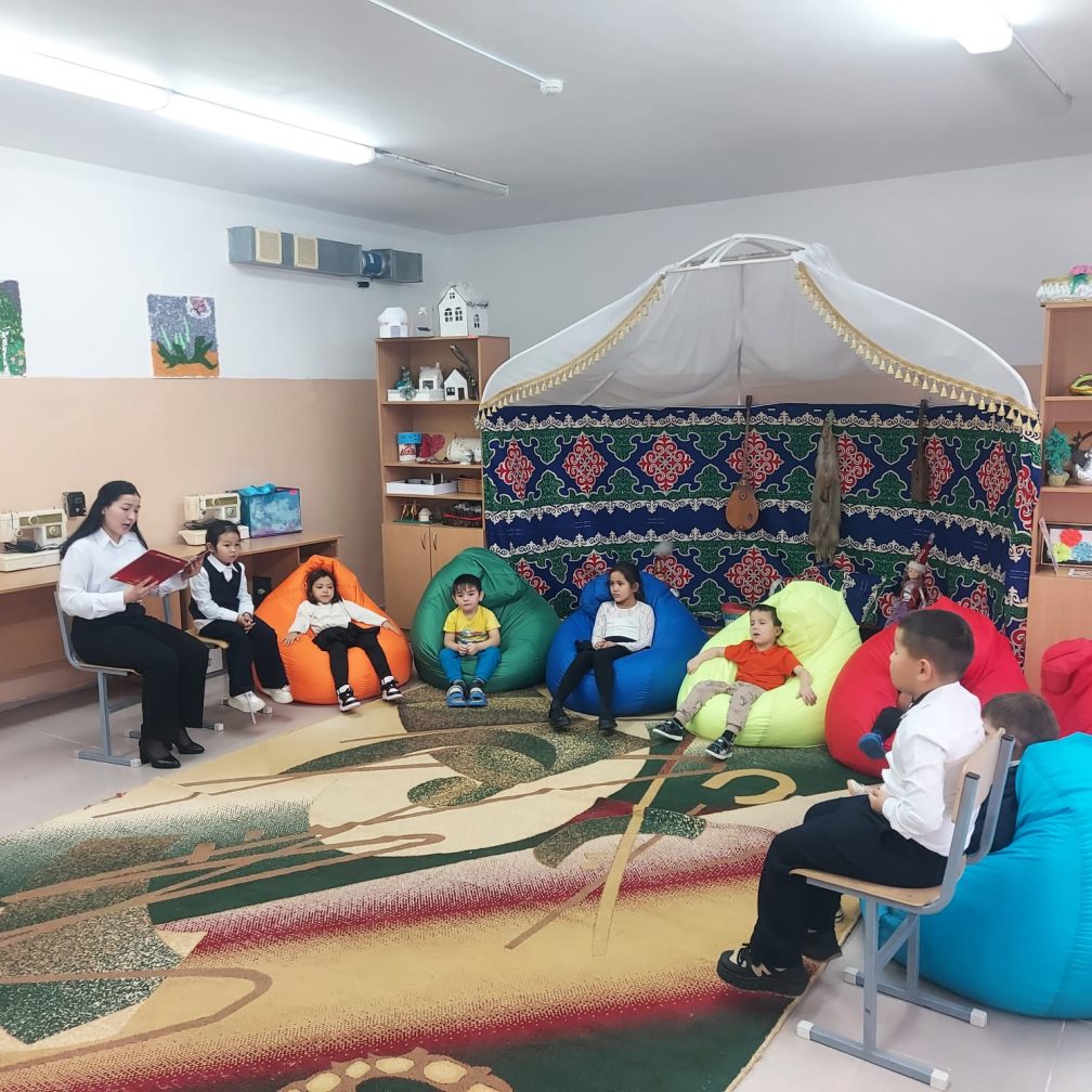 "Адал азамат" "Біртұтас тәрбие" жобасы аясында "Кітап менің қазынам" атты жас тыңдарман жобасы бойынша, жас бүлдіршіндердің кітапқа деген қызығушылықтарын арттыру мақсатымен кітапханашы балаларға қызықты ертегі оқу барысында.