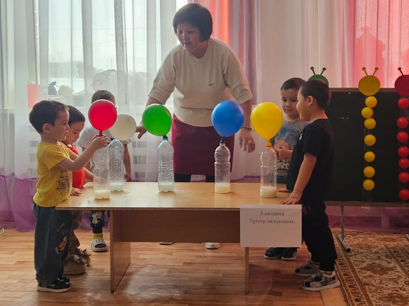 "Балбөбек" шағын орталықта бүлдіршіндермен математика сабағында ашық сабақ өткізілді. Балалар ойын арқылы түстерді айтып, пішіндерді ажырата білді, ойлау, сөйлеу дағдыларын дамытты.