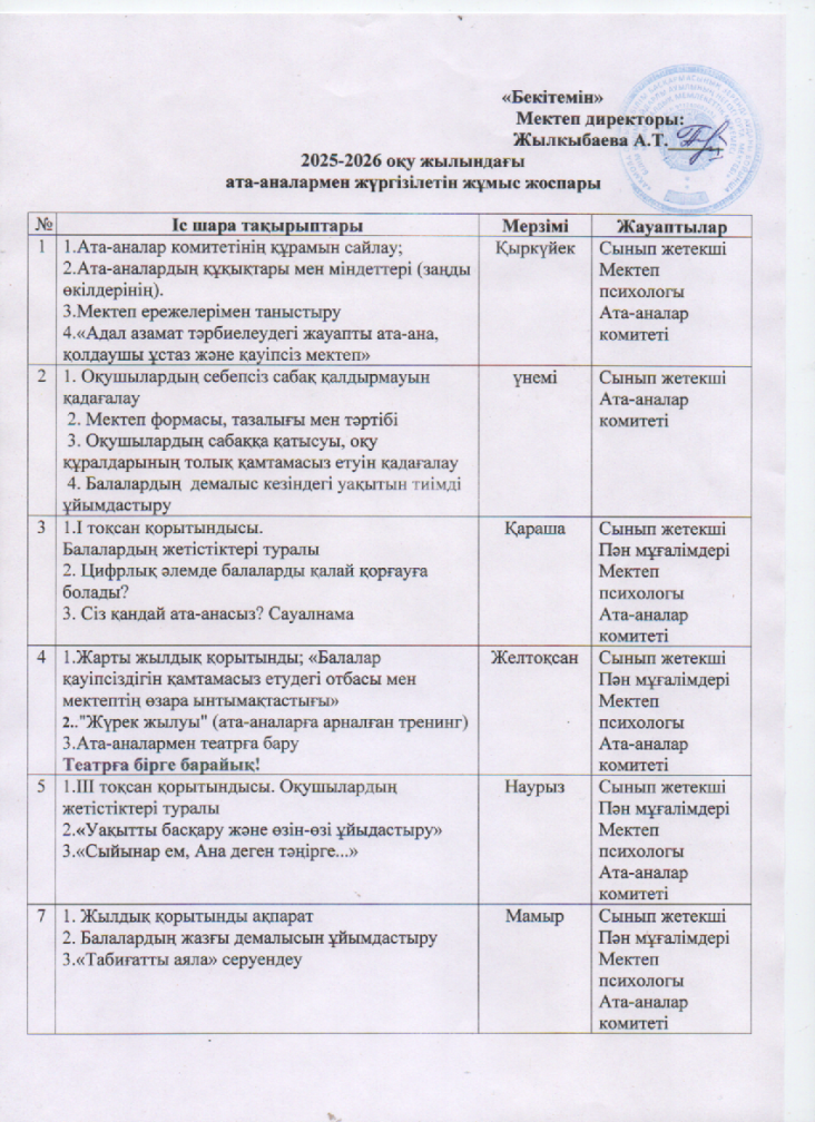 Ата-аналармен жүргізілетін жұмыс жоспары