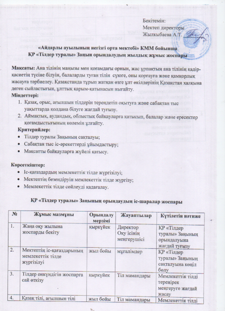 "Тілдер туралы" Заңын орындалудың жұмыс жоспары