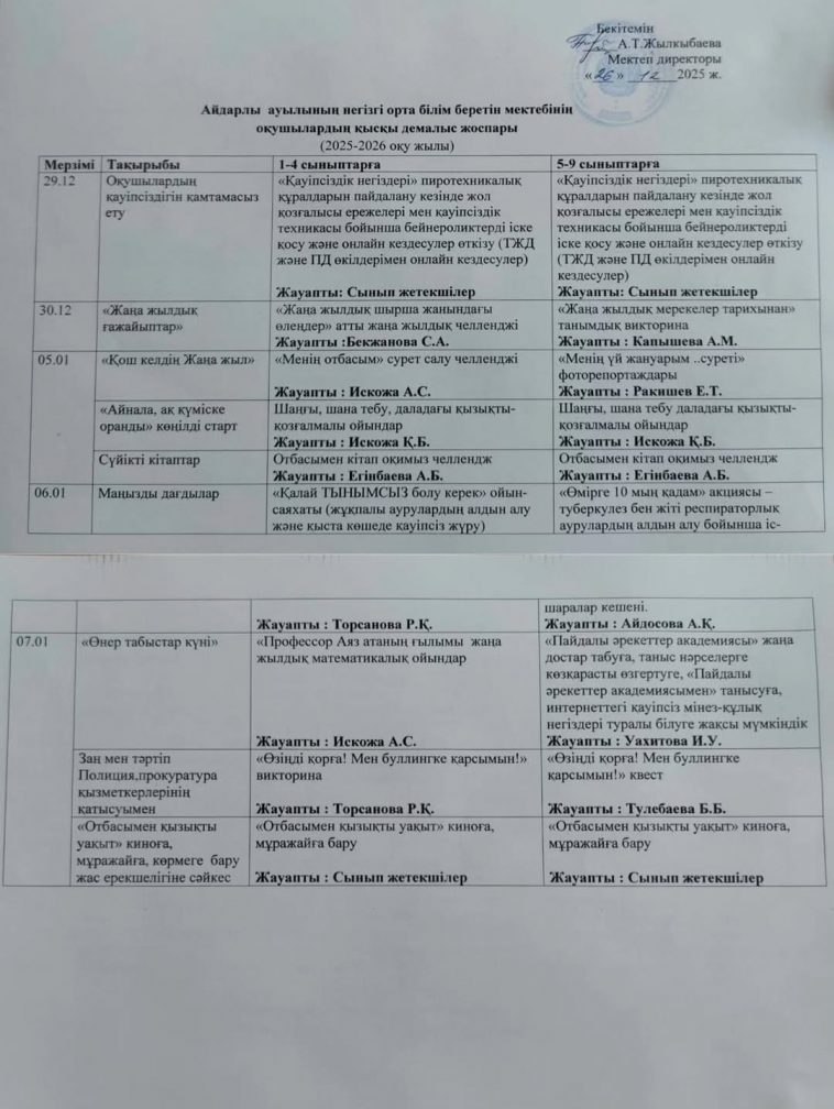 Қысқы демалыс жоспары