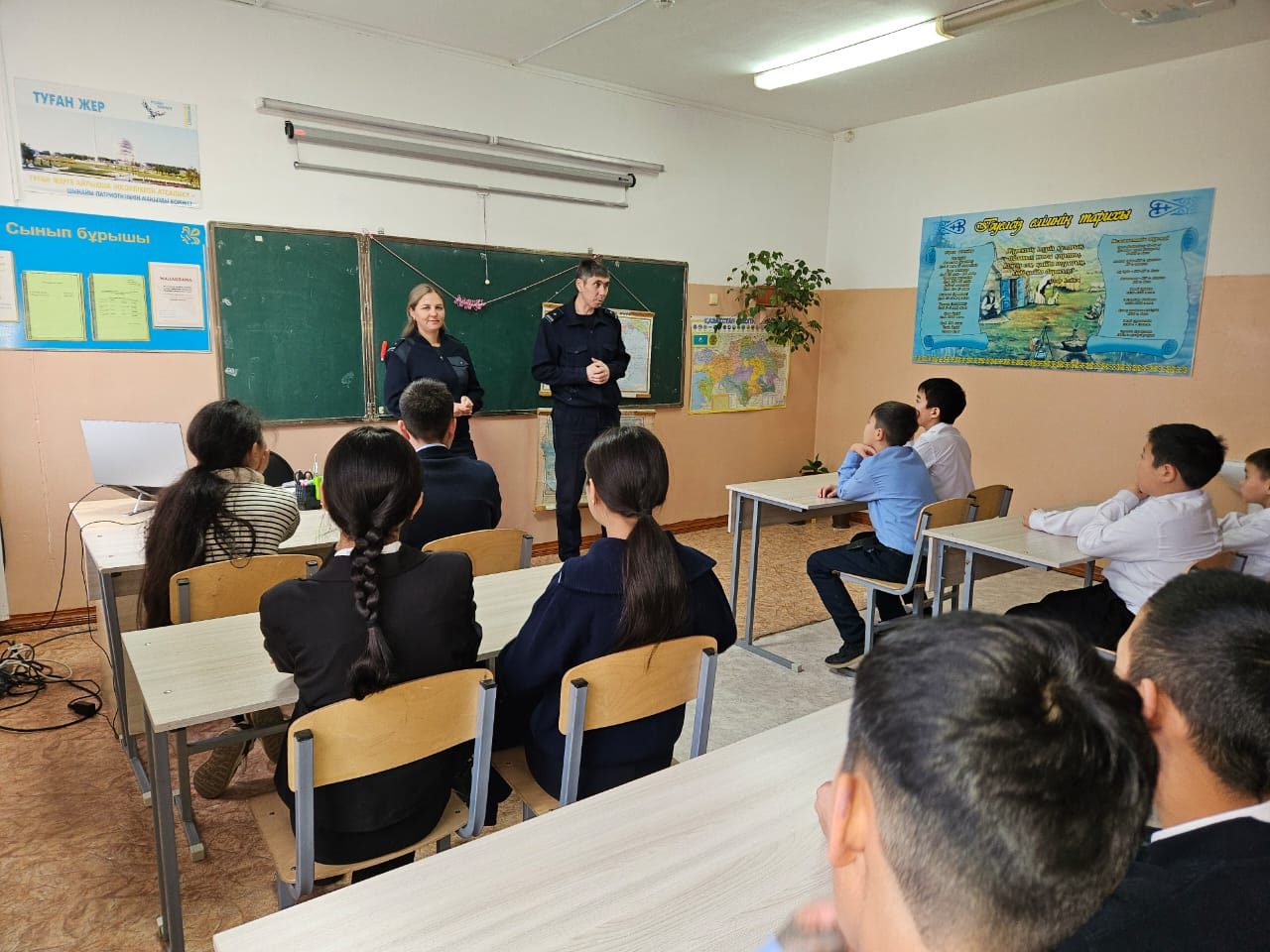 Кәмілетке толмаған істері бойынша инспектор Аубакиров Денисбек 5-9 сынып оқушылармен кездесіп әңгіме өткізді. Кәмілетке толмаған оқушылардың құқықтарын мен міндеттерін түсіндірді. 23.00 ден кейін көшеде қараусыз жүру, ішімдік ішпей, мотоциклмен жүруге тийым салу деген тақырыптар қозғалды. Оқушылар өз пікірлерін айтып, сұрақтар қойды.